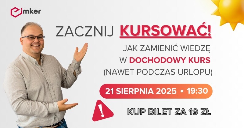 Dlatego jeśli chcesz wystartować z własnym kursem już we wrześniu, zapisz się na webinar „Zacznij kursować”. Cena? 19 zł – mniej niż godzinny wynajem rowerka wodnego nad polskim jeziorem. A zaowocuje jeszcze w tym roku!