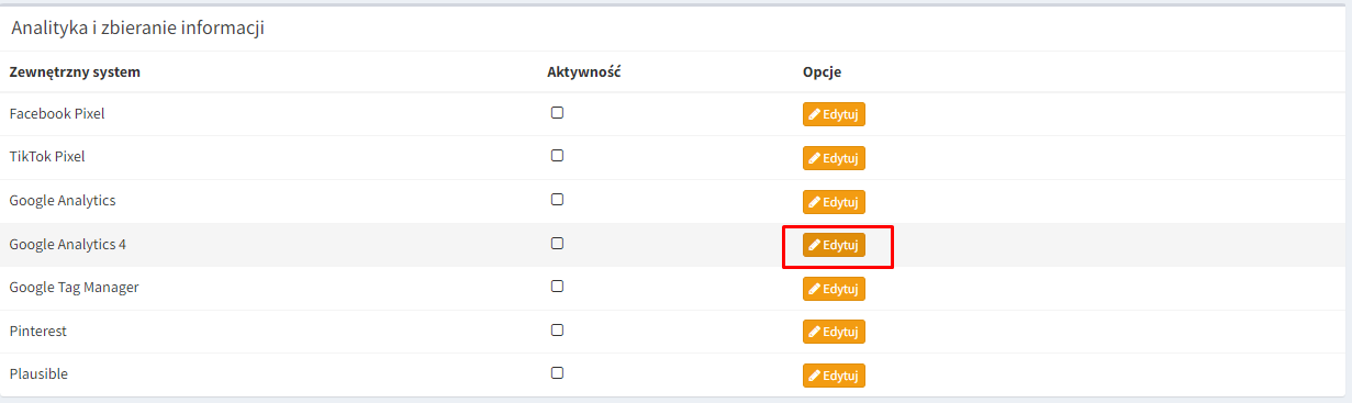 3. Wybierz opcję edytuj przy integracji Google Analytics 4.