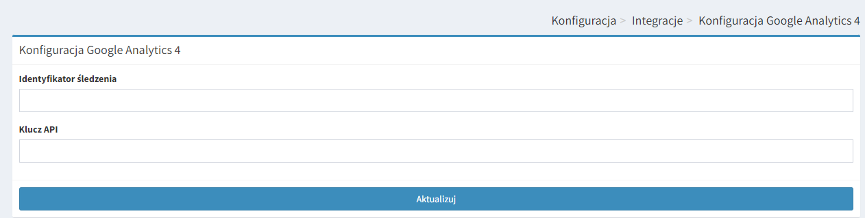 4. Kolejnym krokiem jest umieszczenie w SalesCRM Identyfikator śledzenia (pomiaru) oraz Klucz API w celu wykonania integracji. Dane znajdziesz na swoim koncie Google Analytics, w panelu głównym witryny.