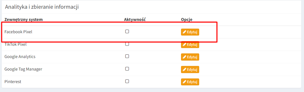 3. Wybierz opcję edytuj przy Facebook Pixel.