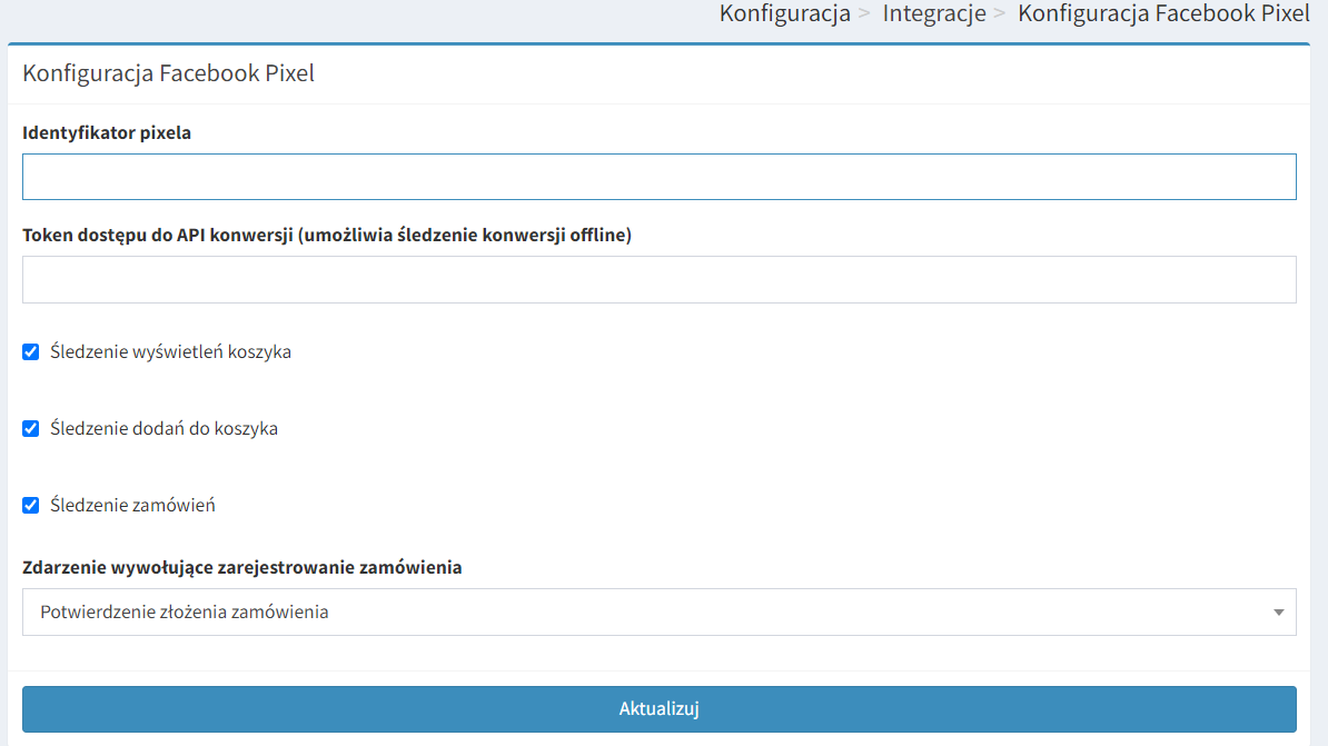 4. Następnie dodaj Identyfikator Pixela, a kolejne opcje uzupełnij tak jak na załączonym zdjęciu. Zatwierdź przyciskiem aktualizuj.