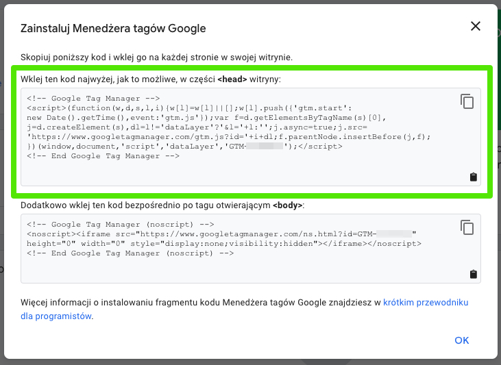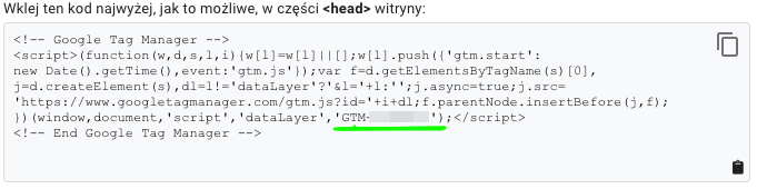 - Do integracji Google Tag Manager w SalesCRM, potrzebujesz skopiować identyfikator śledzenia, który znajdziesz tutaj: