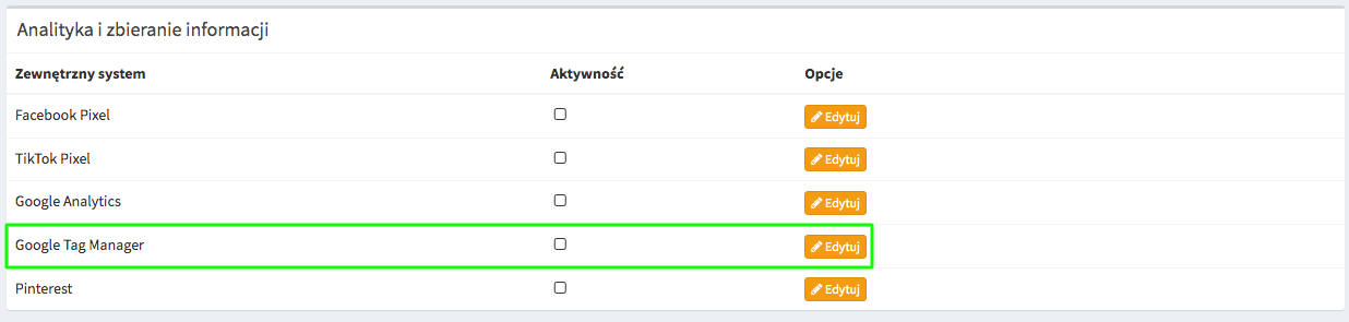 - Wybierz opcję edytuj przy Google Tag Manager.