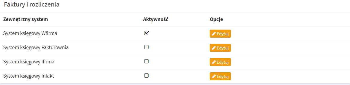 2. Następnie w zakładce Faktury i rozliczenia, odnajdź opcję System księgowy wFirma i kliknij obok niej przycisk Edytuj.