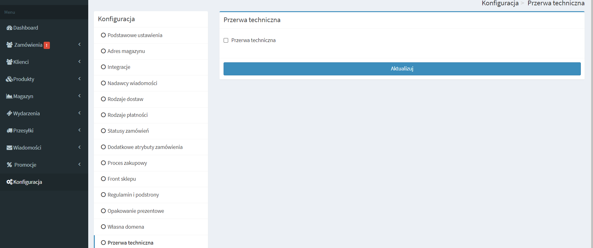 4. Gdy ponownie chcesz przywrócić funkcjonowanie sklepu, wyłącz opcję przerwa techniczna i zatwierdź przyciskiem aktualizuj.