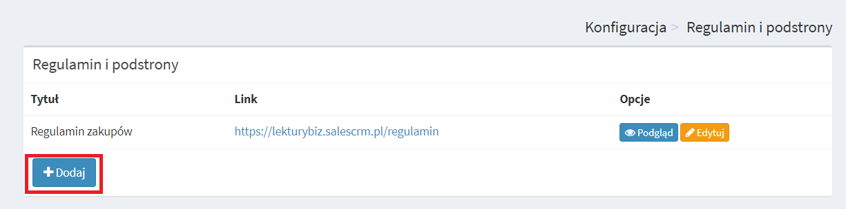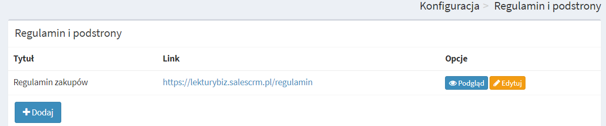 5. Dodatkowo masz możliwość dodania innych treści (np. polityki prywatności) które pojawią się w Twoim sklepie. Aby to zrobić wybierz opcję +Dodaj, a później wpisz tytuł oraz treść.