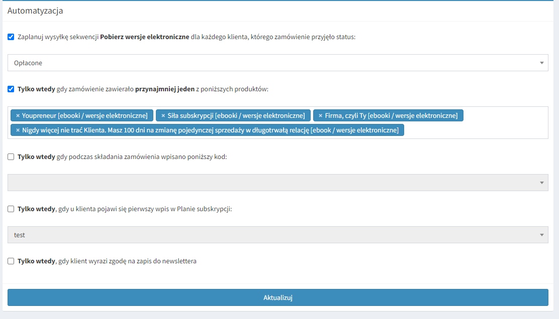 Określamy dla jakiego statusu, ma być aktywowana automatyzacja oraz których produktów ma dotyczyć. Ponadto możemy tutaj ustawić aktywację na kod, subskrypcję lub newsletter.