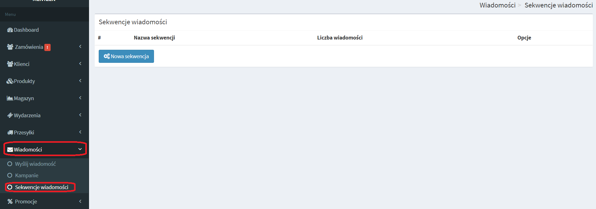 W celu stworzenia sekwencji wiadomości w panelu SalesCRM przejdź do zakładki Wiadomości > Sekwencje wiadomości i wybierz Nowa sekwencja.
