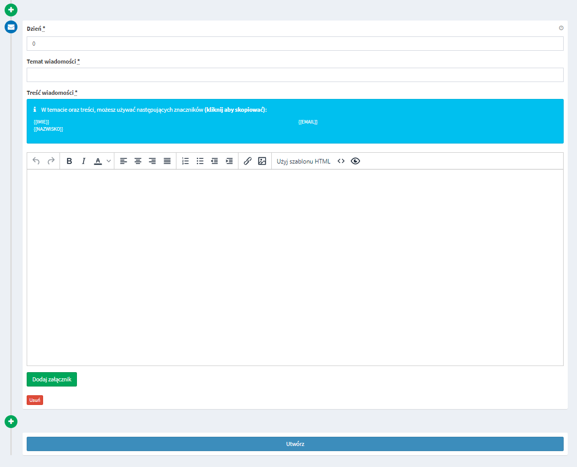 W następnej kolejności w celu dodania treści wiadomości, która zostanie wysłana dla klientów (możesz dodać jedną lub więcej wiadomości), naciśnij zielony przycisk + i uzupełnij: