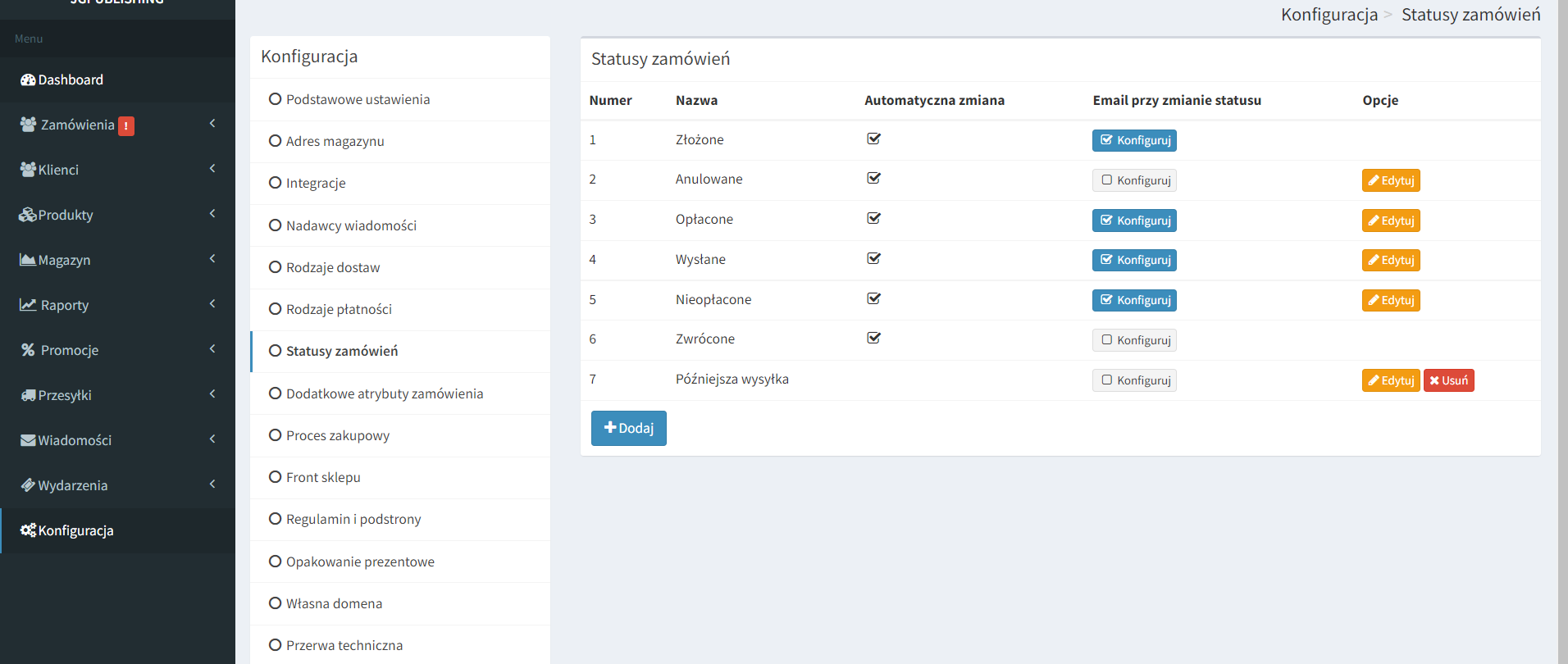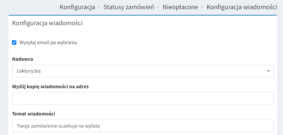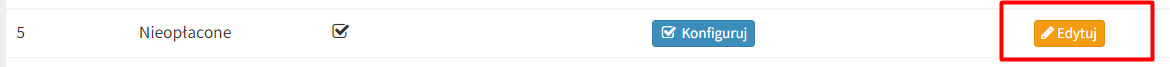 2. Kolejnym krokiem jest konfiguracja treści wiadomości statusu wysyłanego do klienta. Wybierz opcję konfiguruj przy statusie nieopłacone.
