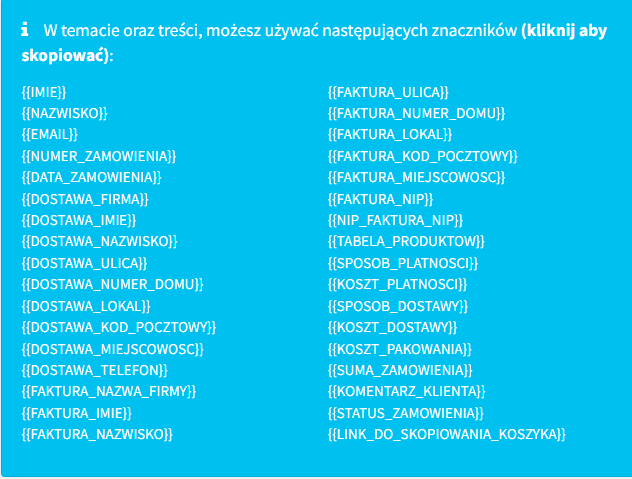 5. Następnie przejdź do treści wiadomości. Po lewej stronie na niebieskim tle masz znaczniki, które możesz skopiować i wkleić bezpośrednio do treści. W przypadku opisywanego statusu, szczególnie przydatne będą link do skopiowania koszyka oraz link do płatności.