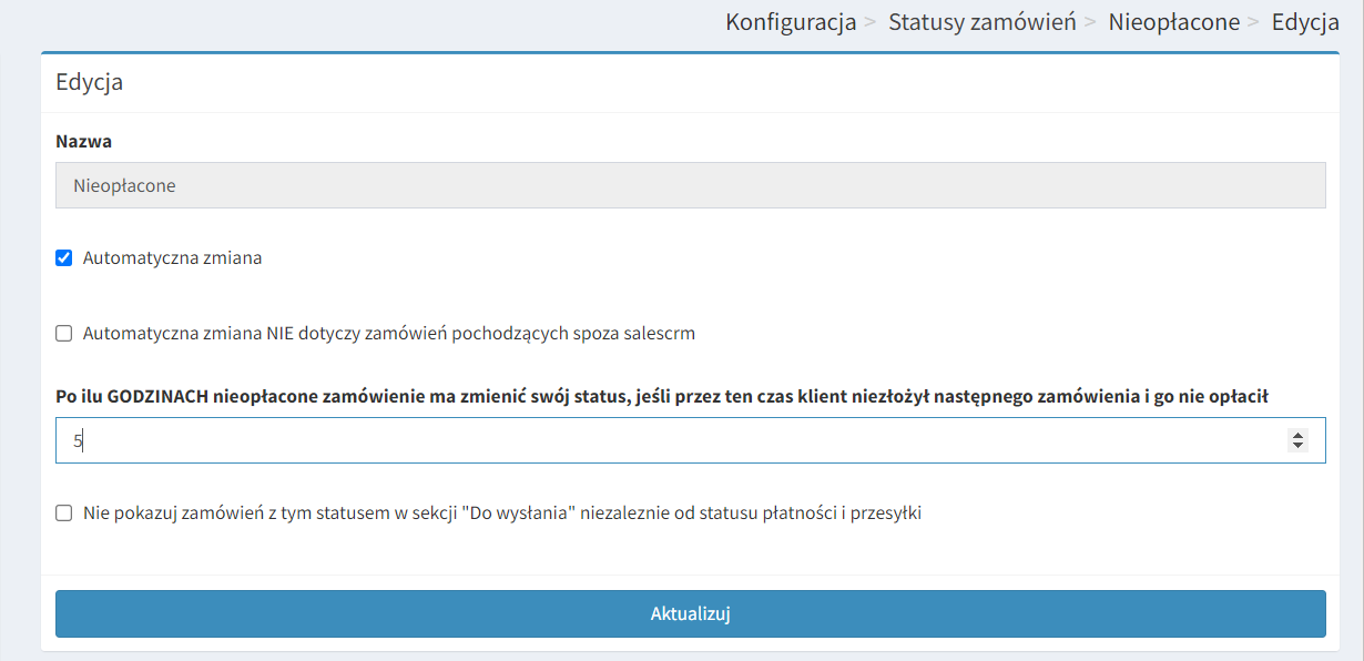 8. Zaznacz checkboxa automatyczna zmiana. Później przejdź niżej, znajduje się tam opcja Po ilu GODZINACH nieopłacone zamówienie ma zmienić swój status, jeśli przez ten czas klient nie złożył następnego zamówienia i go nie opłacił – wpisz odpowiednią liczbę i potwierdź przyciskiem Aktualizuj.