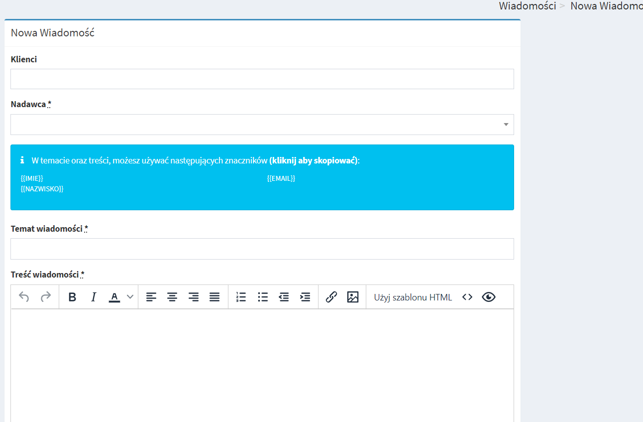 - klienci – wpisz e-maile klientów do których chcesz wysłać wiadomość